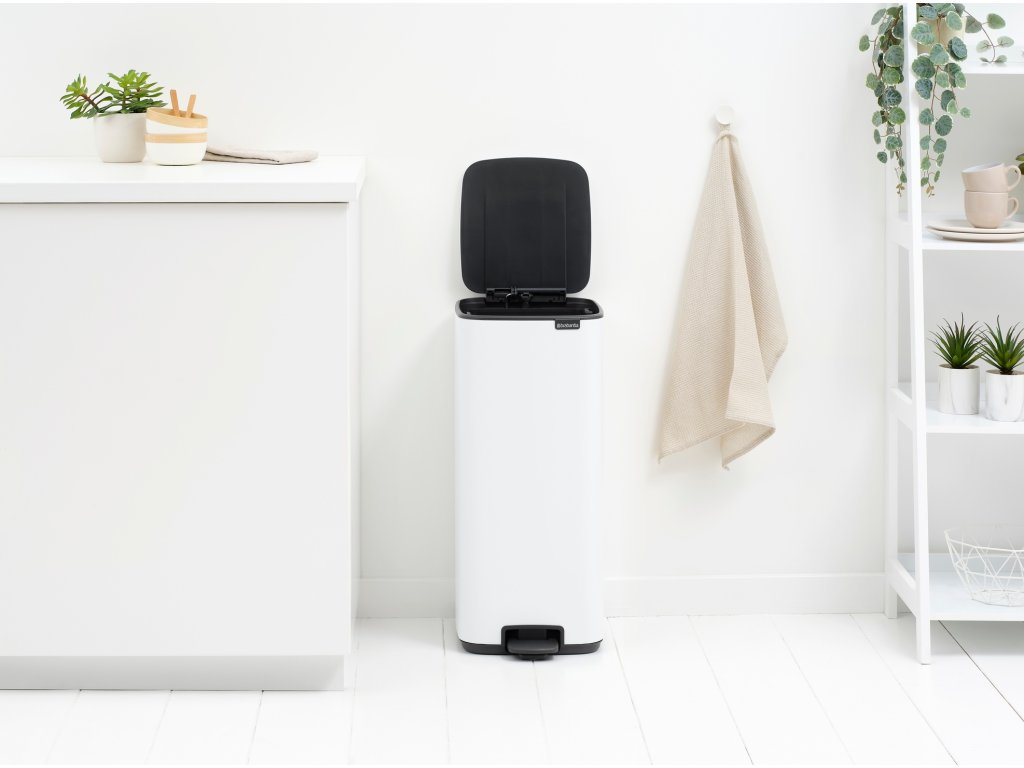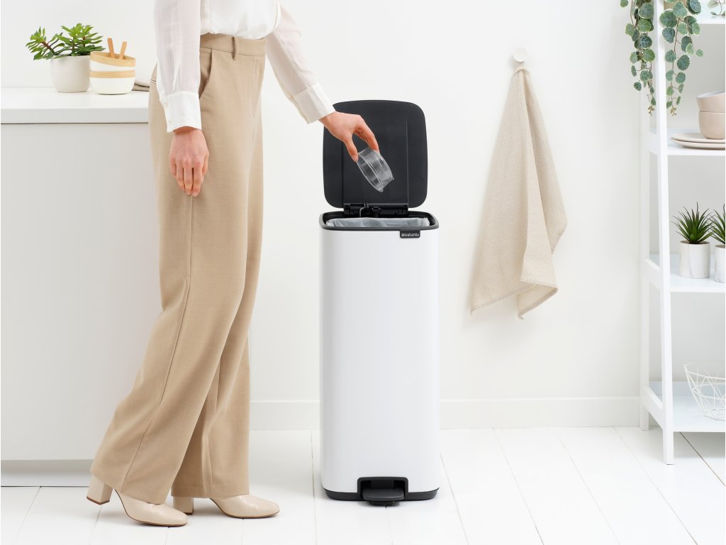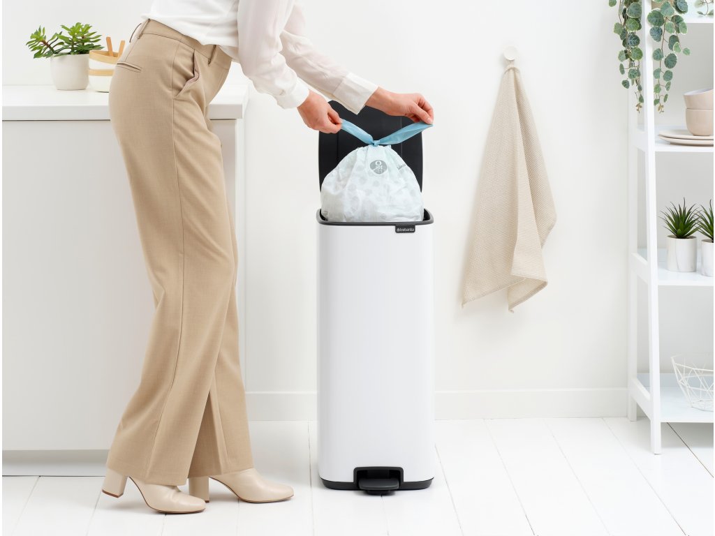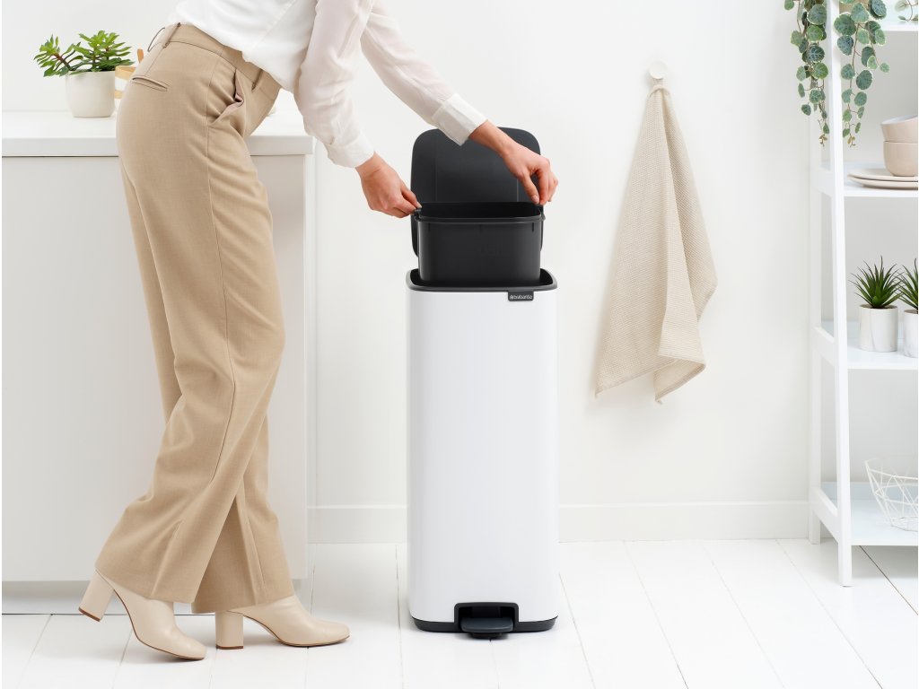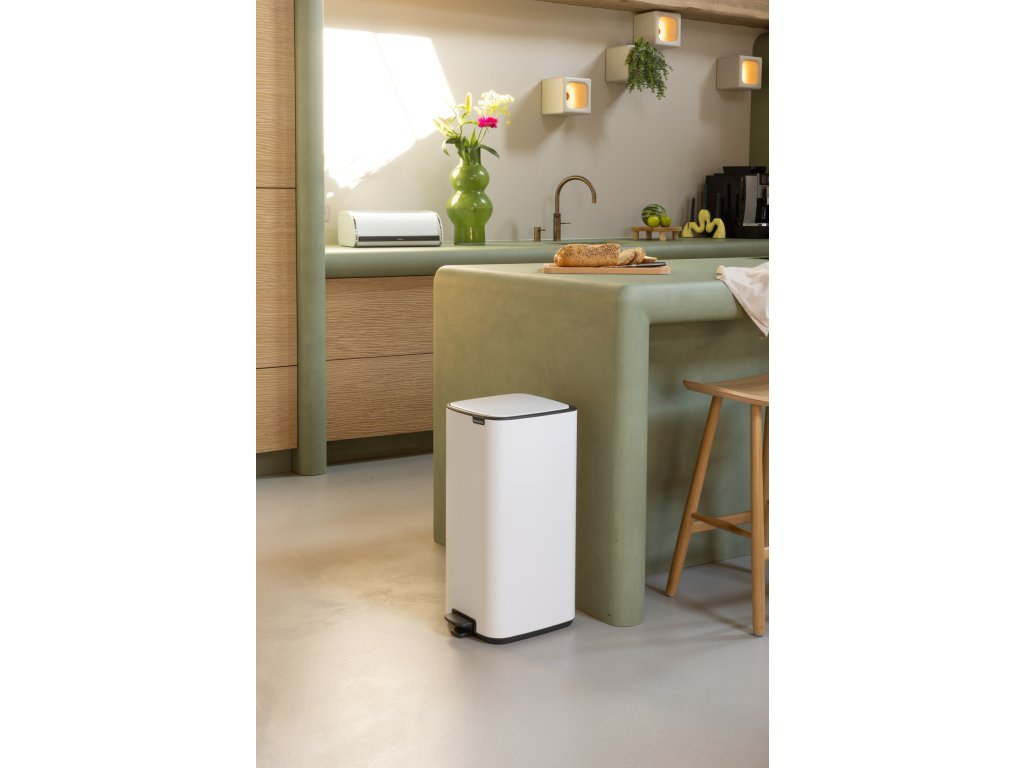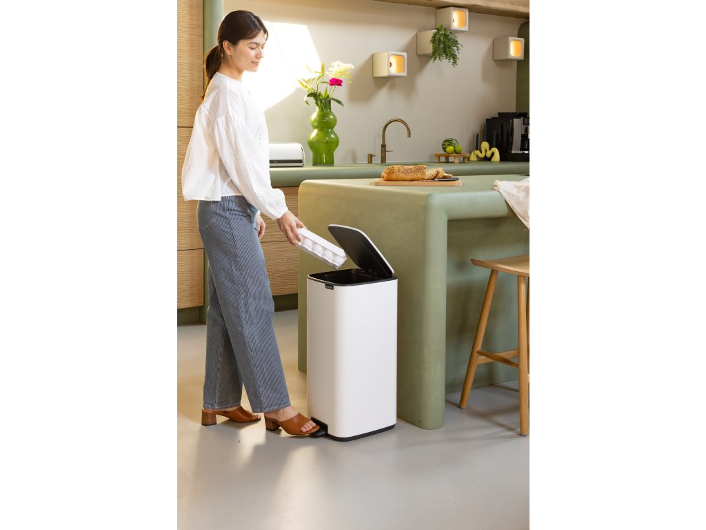 Chcete skvělý odpadkový koš s maximálním stylem? Tento štíhlý pedálový koš Brabantia Bo o objemu 30 litrů je krásný zvenku i zevnitř. Šetří místo, má hygienické ovládání pedálem a víko, které se po dokončení jemně zavírá – pro tuto štíhlou krásku není žádná objednávka příliš vysoká. Je čas na úklid? Vyjměte vnitřní kbelík a přenášejte koš za transportní rukojeť. K dispozici je dokonce i funkce ponechání otevřené polohy, která vám pomůže s úklidem. Tento vysoký a elegantní pomocník v domácnosti se také přizpůsobí zdi. Zvolte Bo!