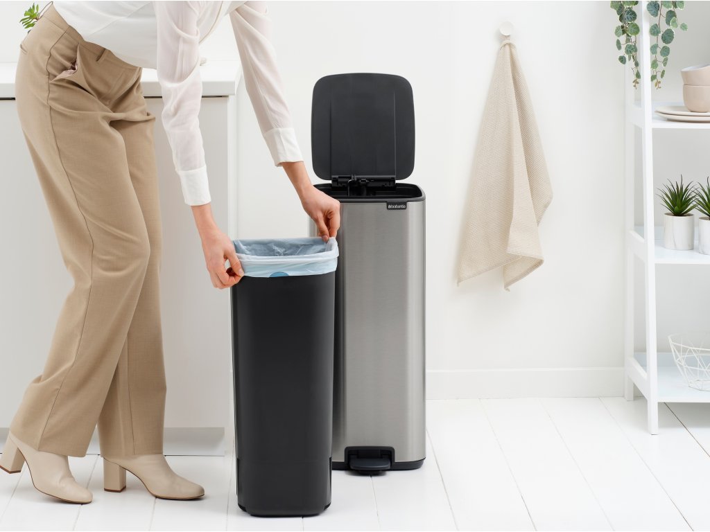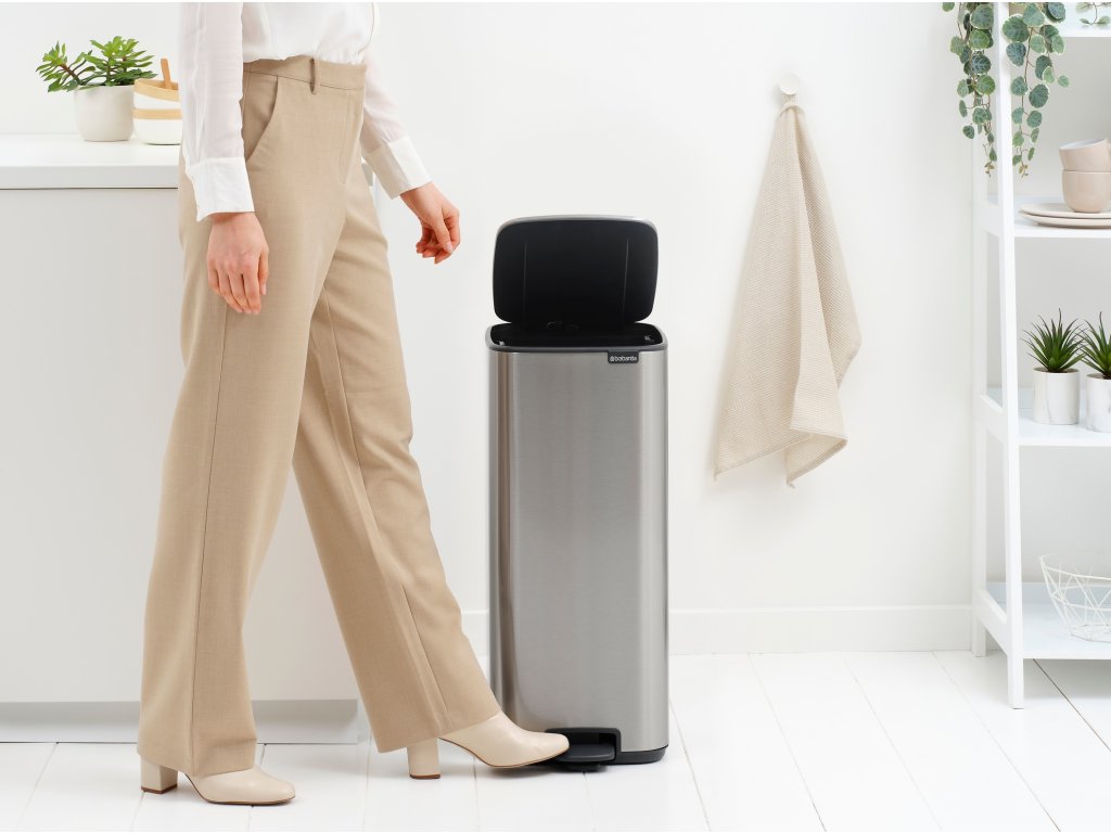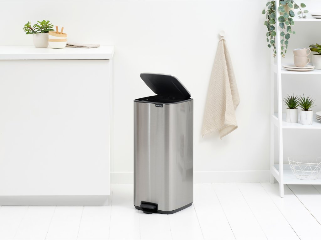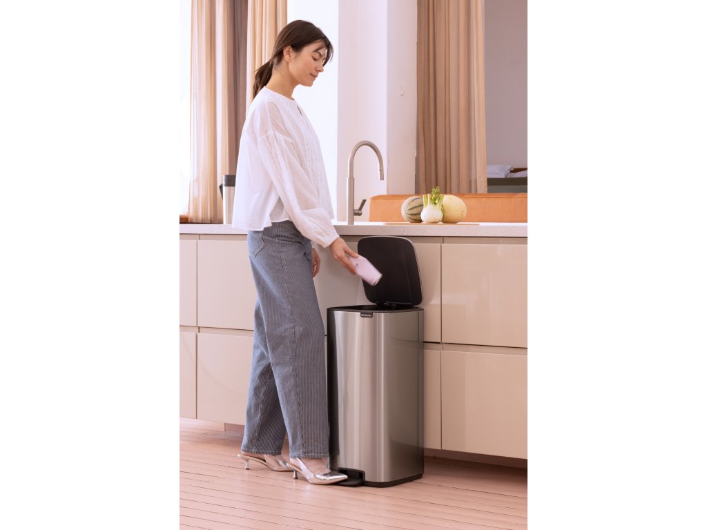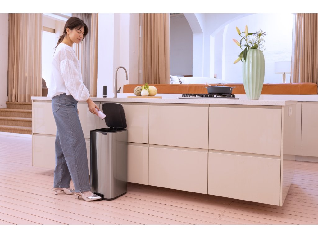 Chcete skvělý odpadkový koš s maximálním stylem? Tento štíhlý pedálový koš Brabantia Bo o objemu 30 litrů je krásný zvenku i zevnitř. Šetří místo, má hygienické ovládání pedálem a víko, které se po dokončení jemně zavírá – pro tuto štíhlou krásku není žádná objednávka příliš vysoká. Je čas na úklid? Vyjměte vnitřní kbelík a přenášejte koš za transportní rukojeť. K dispozici je dokonce i funkce ponechání otevřené polohy, která vám pomůže s úklidem. Tento vysoký a elegantní pomocník v domácnosti se také přizpůsobí zdi. Zvolte Bo!