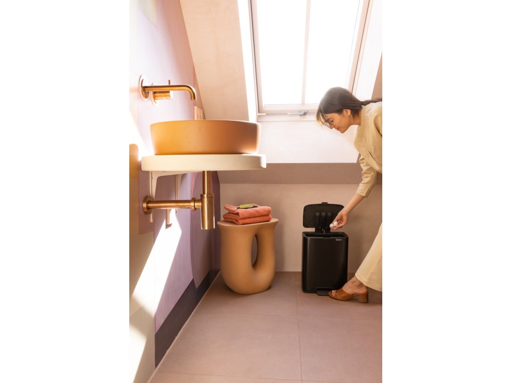 Tento koš Brabantia Bo s pedálem o objemu 12 l je docela praktický! Dostatečně malý, aby se dal schovat pod pracovní desku, a dostatečně stylový, aby se dal nechat na očích. A také užitečný díky svému prostorově úspornému obdélníkovému designu, hygienickému ovládání pedálem a odnímatelnému vnitřnímu kbelíku. Víko s tichým zavíráním se otevírá lehkým dotykem nohy, nebo ho můžete otevřít i ručně zvednutím okraje víka. Ještě hygieničtější – tento koš má funkci ponechání otevřené polohy pro snadné čištění a výměnu vložky. Ještě snadnější – tento krásný koš má vzadu madlo pro přenášení z místnosti do místnosti. Do toho, Bo!
