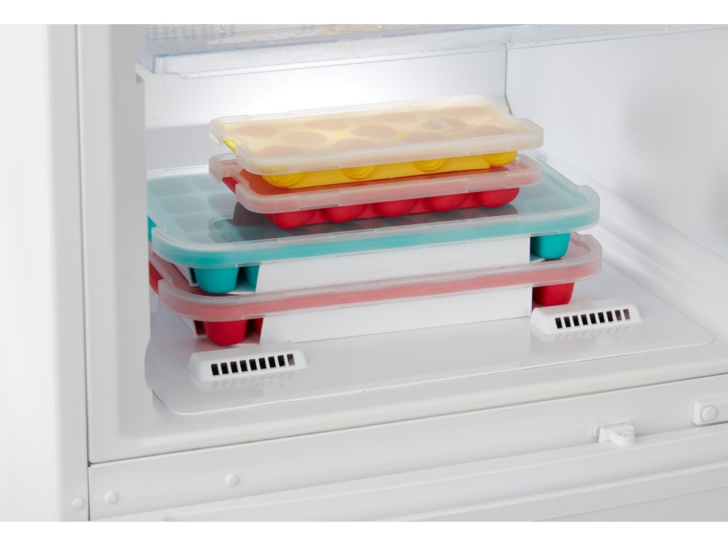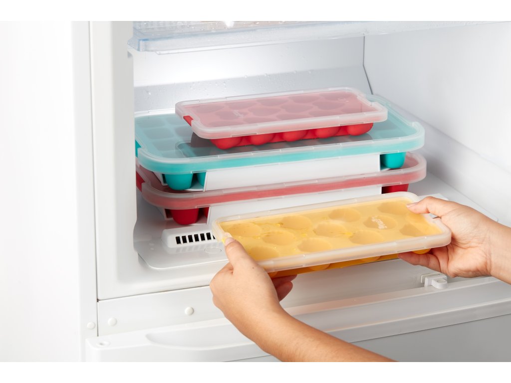 Součástí je víko, které zabraňuje přenosu pachů z mražených potravin na kostky ledu. Umožňuje také stohovat formičky na led a další nádoby, čímž šetří místo. Je stabilní, takže formičku na led můžete přemisťovat a umisťovat do zásuvek mrazničky bez úniku vody.
