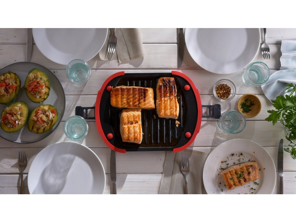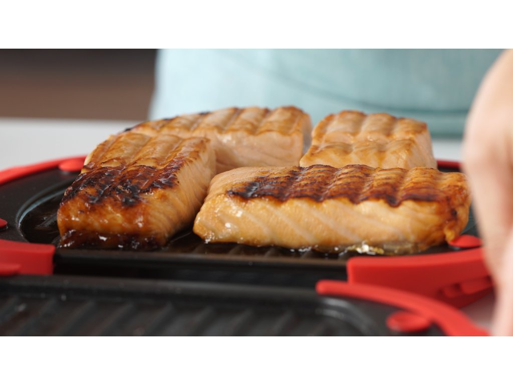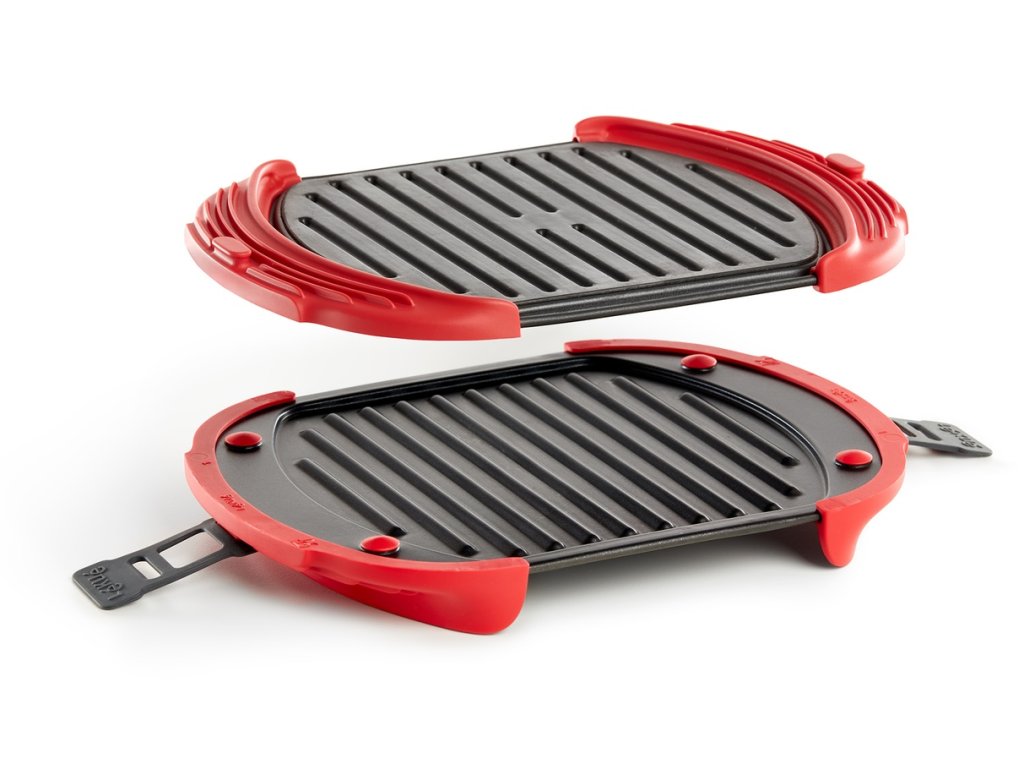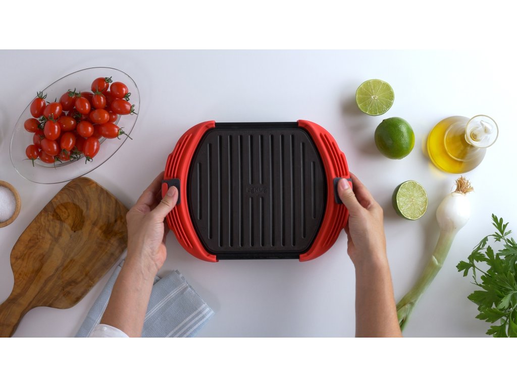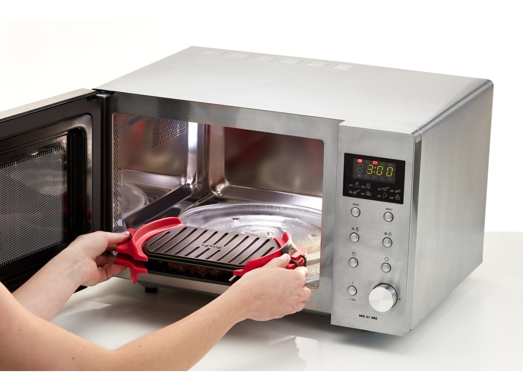 Díky této nové větší verzi, která má o 60 % větší užitnou plochu než původní mikrovlnný gril (1-2 porce), budete moci připravit 3 až 4 porce.