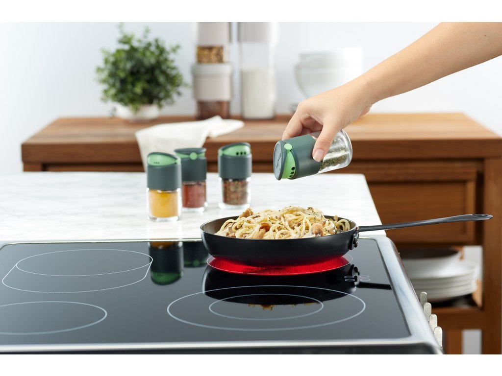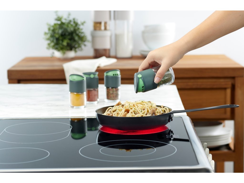 Praktická dóza na všechny druhy práškového a bylinkového koření. Navrženo pro efektivnější použití: Můžete ji otevřít jednou rukou a pomocí 2 poloh nasypat požadované množství. Vaše koření bude ve vaší kuchyni uspořádané a vždy připravené dodat chuť vašim pokrmům!