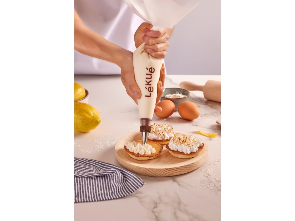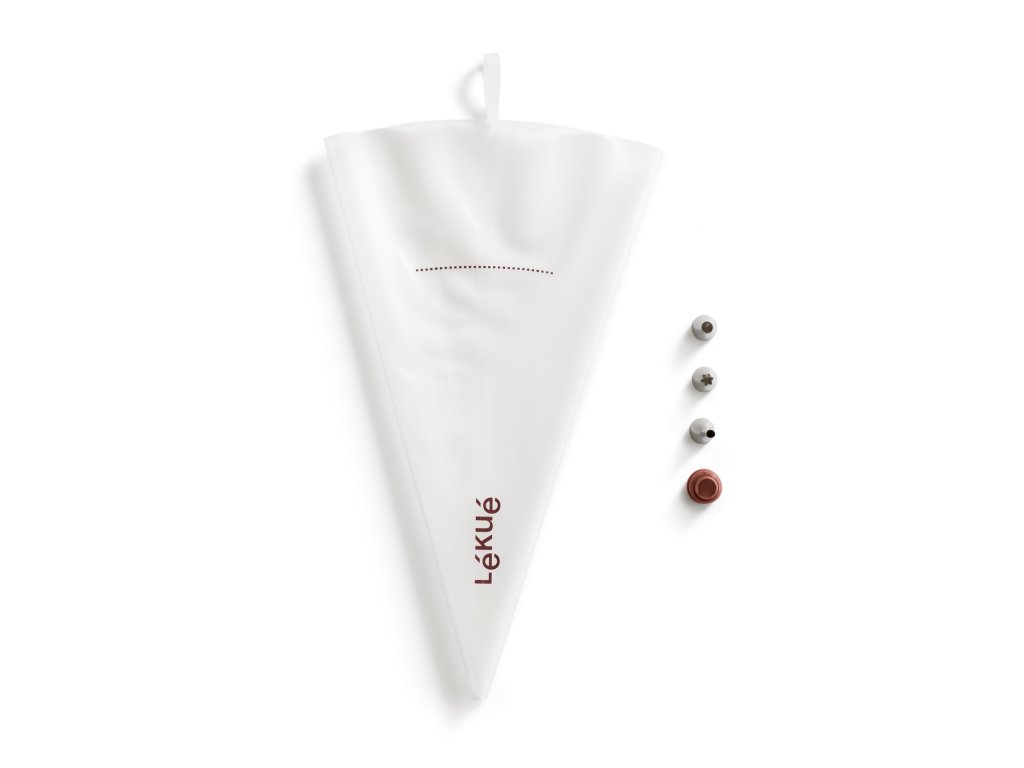 Zdobte, napichujte a plňte své dezerty s použitím menšího množství plastu! Sada obsahuje 1 opakovaně použitelný zdobicí sáček, 3 trysky a 1 spojku.