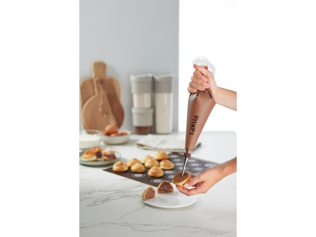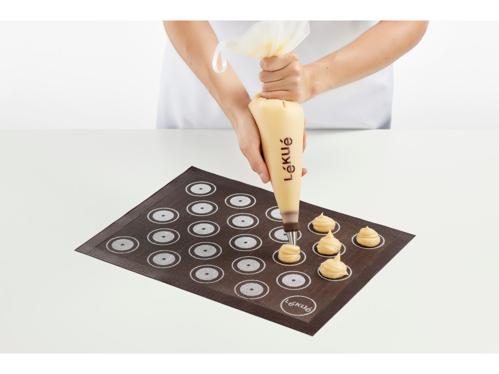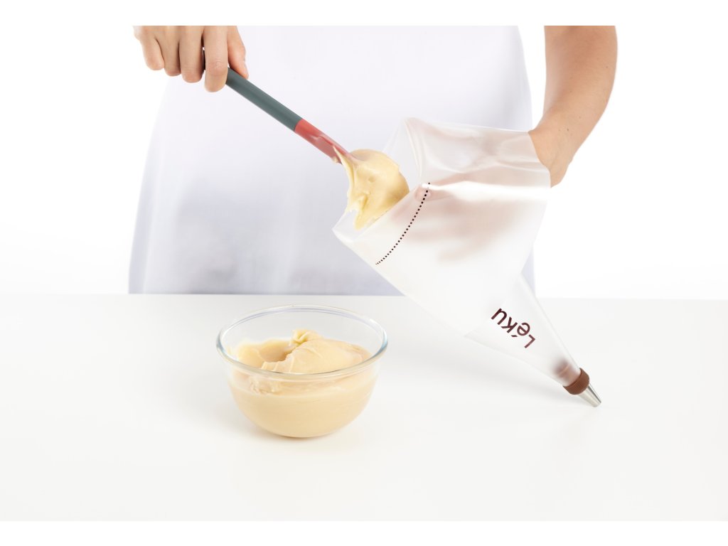 Díky tenkému, pružnému materiálu a potřebné pevnosti, která zabraňuje vyvíjení příliš velkého tlaku, můžete s těstem perfektně manipulovat, stejně jako s tradičním plastovým zdobicím sáčkem.