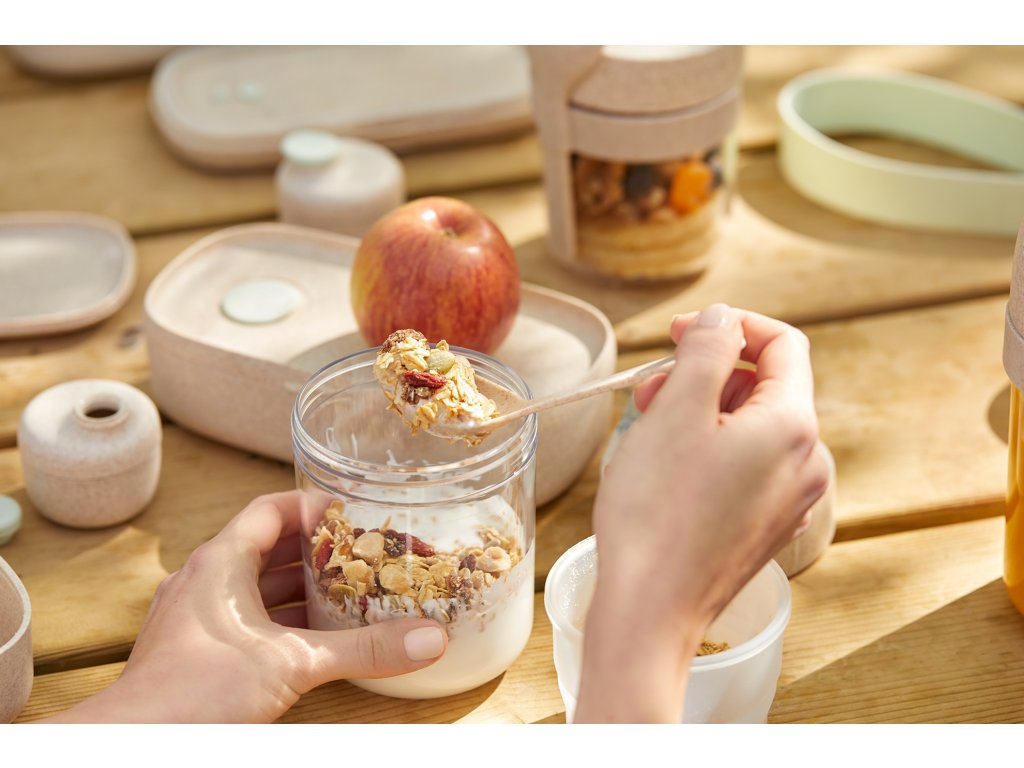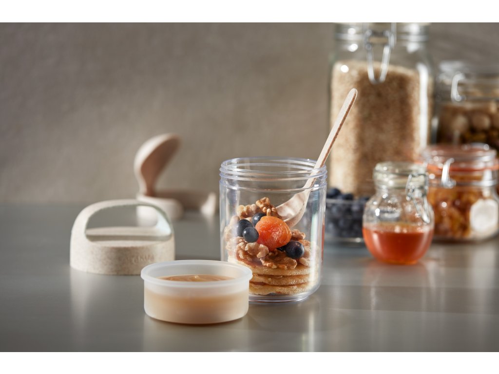 Součástí je skládací silikonová nádoba s nastavitelnou výškou, takže si můžete upravit porce a uchovávat odděleně ingredience s různou texturou, jako jsou křupavé, suché polevy na jogurt nebo dokonce dresinky na křupavé saláty.