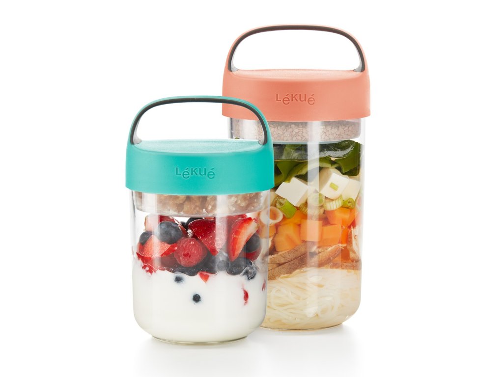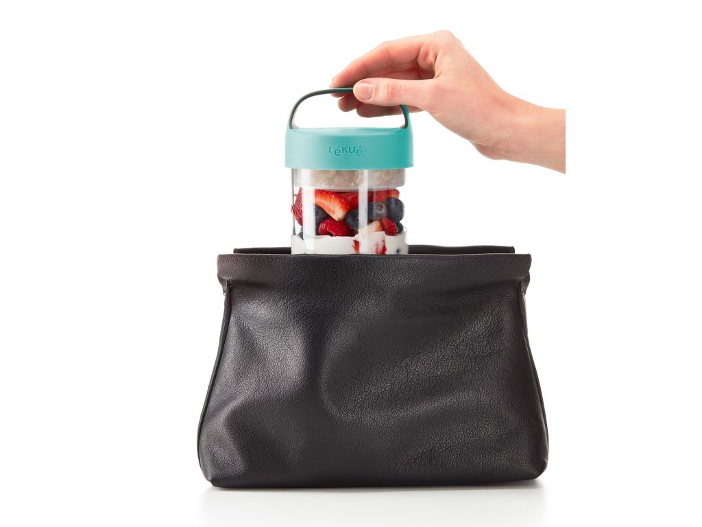 Součástí je skládací silikonová nádoba s nastavitelnou výškou, takže můžete upravovat porce a uchovávat odděleně ingredience s různou texturou, jako jsou křupavé, suché polevy na jogurt nebo dokonce dresinky na křupavé saláty.